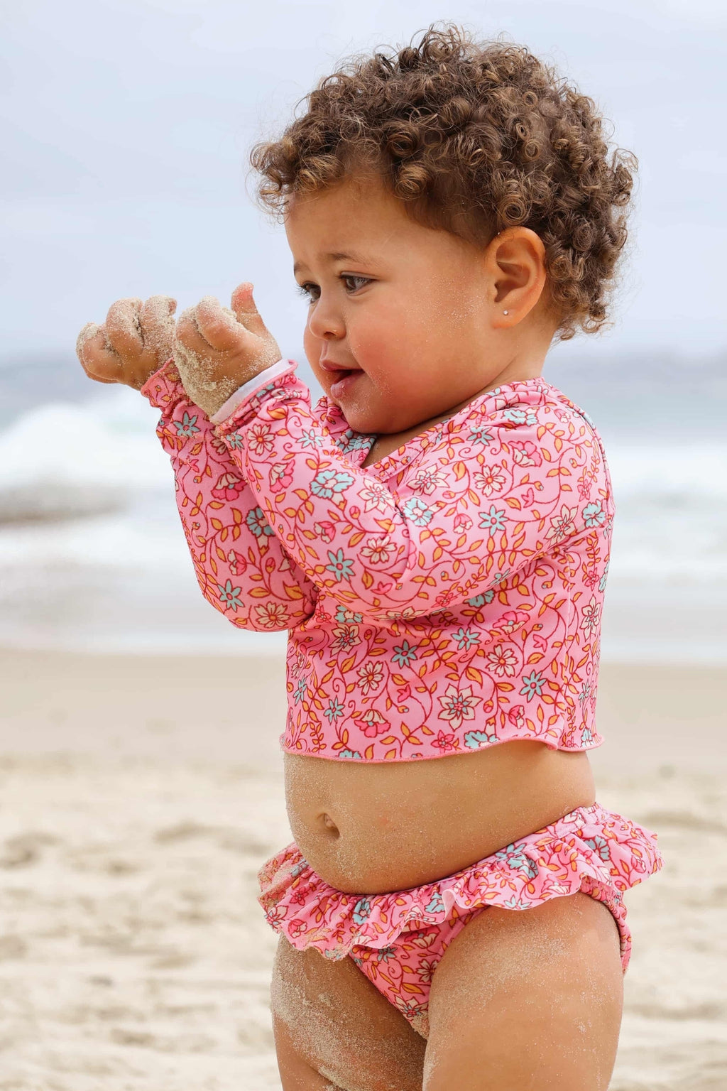 We LOVE this set - I can relax knowing my daughters shoulders and upper body are protected from the sun and she loves that she's also wearing a bikini of sorts. The frill bottoms are a massive hit and the set is very true to size. Also very convenient for getting on and off for bathroom visits etc particularly when wet