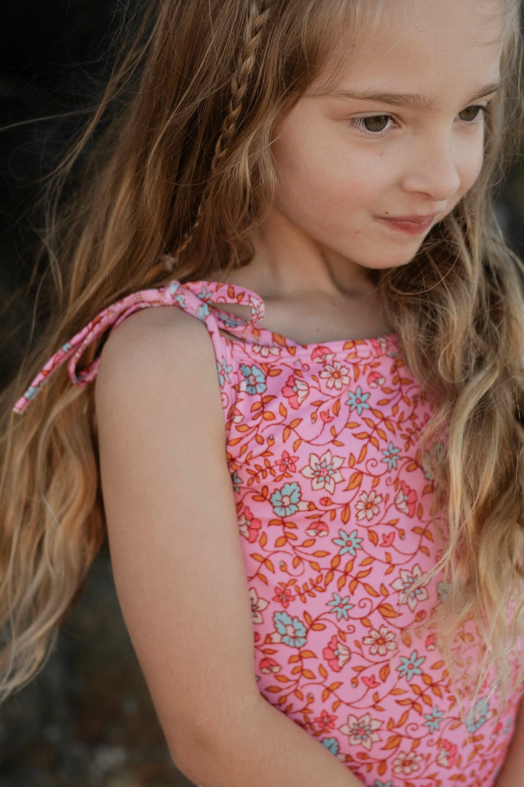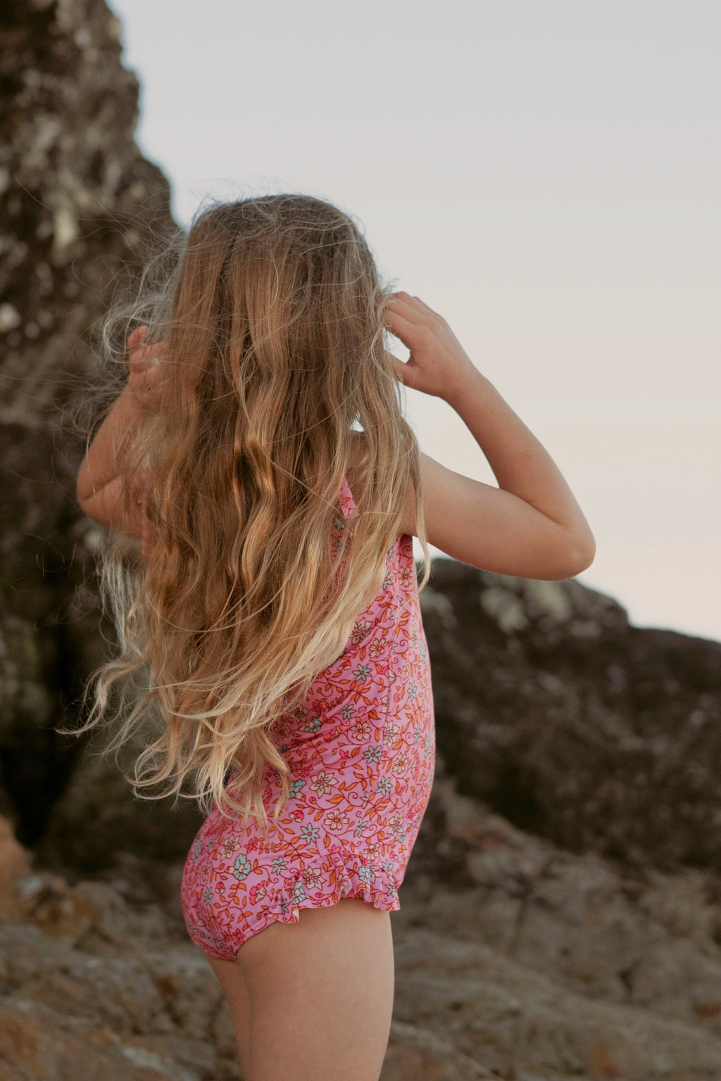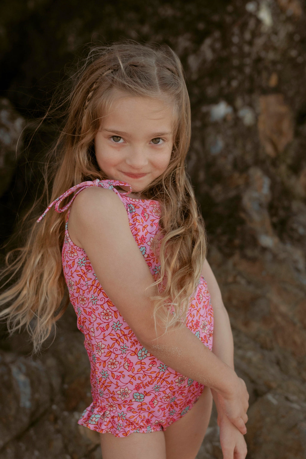 Our girls one piece swimsuit is made for little beach lovers. Featuring bow tie straps and playful frill details on the hip, this full piece combines comfort with coastal charm. Crafted from eco-friendly recycled fabric with UPF 50+ protection, it’s perfect for pool parties, sandy adventures, and long summer days by the water.