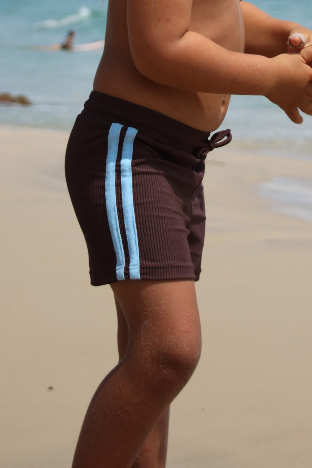 These swim shorts are crafted from chocolate eco-rib fabric and finished with a double racer stripe in soft blue terry towelling for a nostalgic, surf-inspired look.